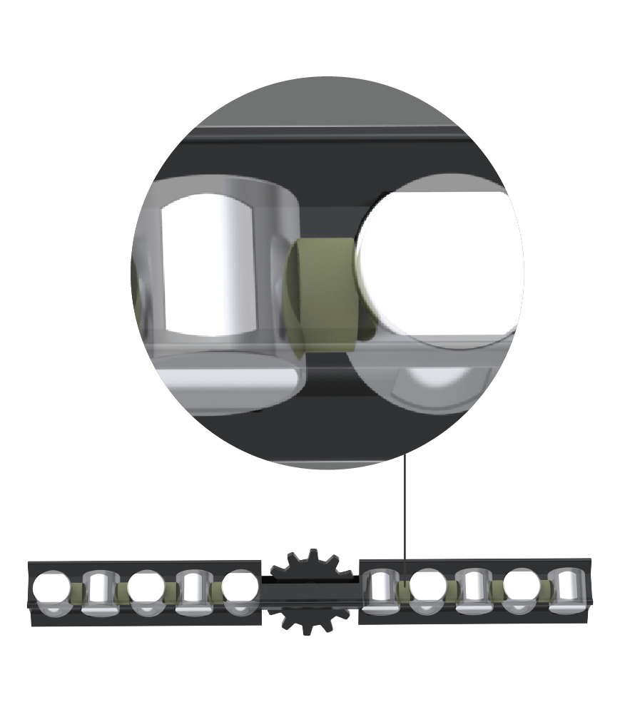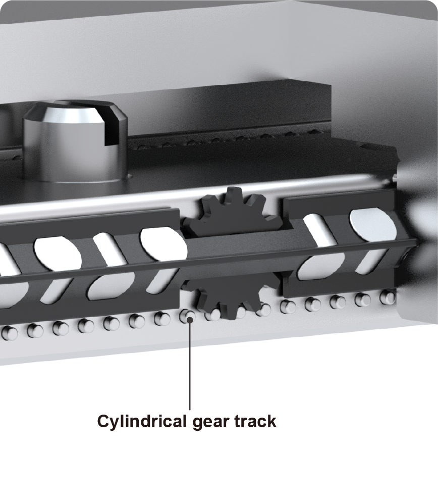 cpc 專利anti creep設計,透過保持器上的齒型輪跟具圓柱狀齒軌軌道的嵌合,來防止滾子在運行時產生偏移或滑動。